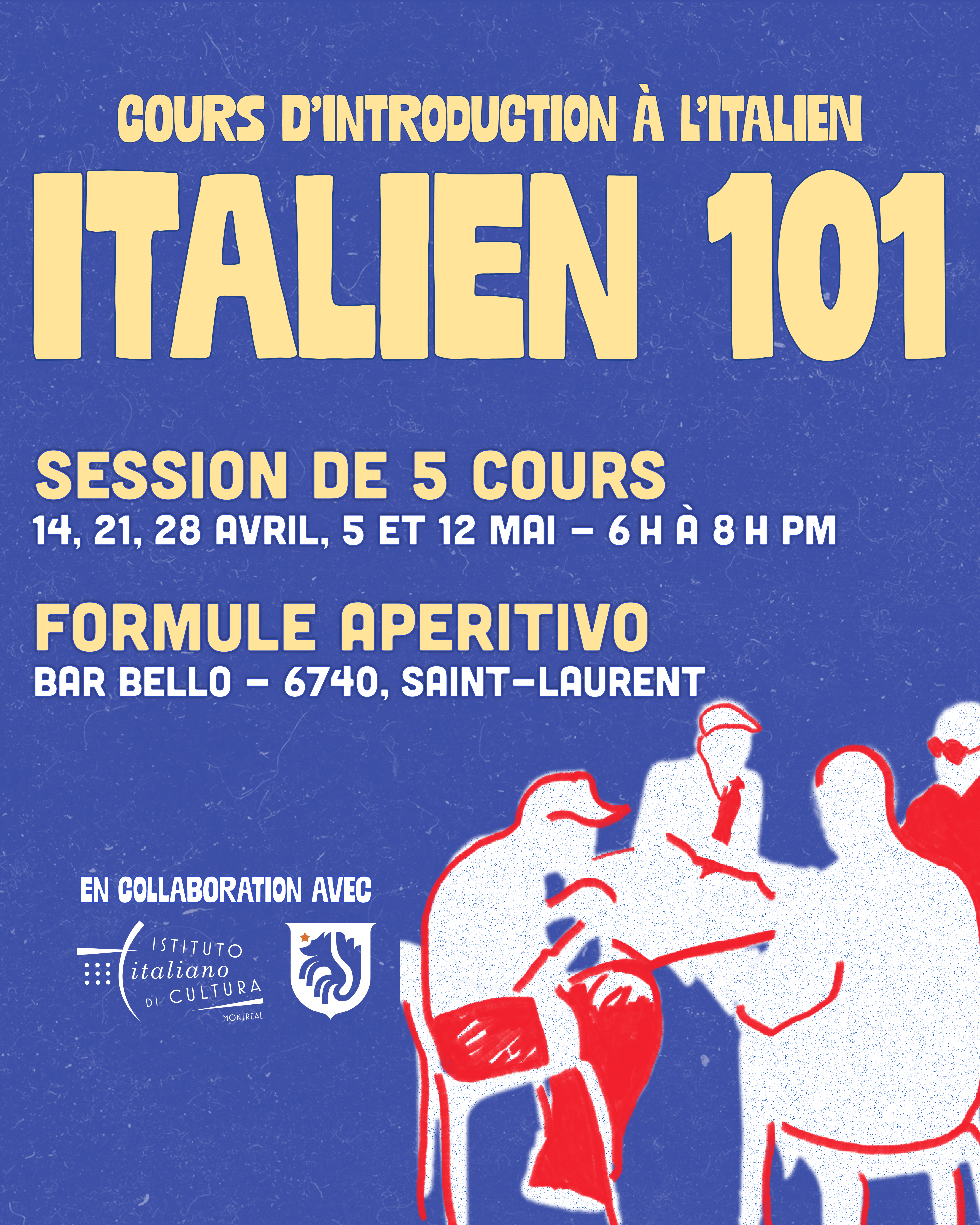 Ces cours d’introduction vous enseigneront les bases de la langue, en plus d’expressions et de phrases utiles pour commander: au restaurant 🍝, au cafĂ© ☕ et au bar 🍾 , le tout au cours de cinq sĂ©ances qui auront lieu les 14, 21 et 28 avril ainsi que les 5 et 12 mai 2026.